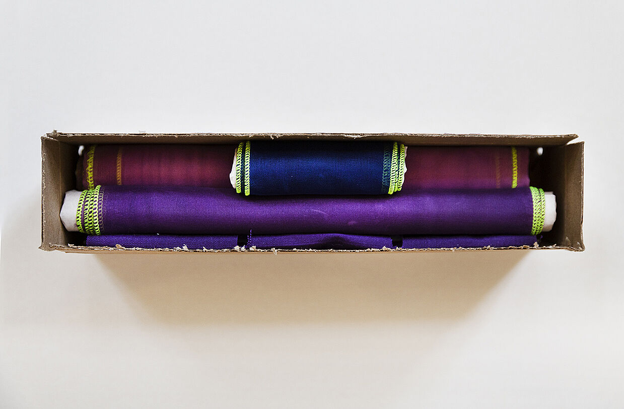 Die Stoffe liegen schon zickzackförmig auf dem Boden, sie müssen sich entfalten können. Nichts hat sich verknotet, alles passt.