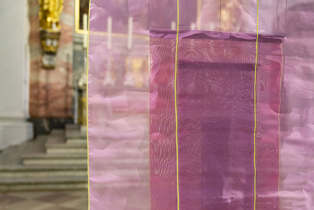 Violett ist die Farbe der Fastenzeit. Vier verschiedenfarbige Stoffe, von dunkelblau bis fliederfarben, werden ohne Abstand hintereinander gehängt. Das Dunkelblau findet sich in dem Altarbild wieder. Es wandelt sich durch künstliches Licht in der Kirche und Gelb-Töne hinter den Tüchern in ein Violett.